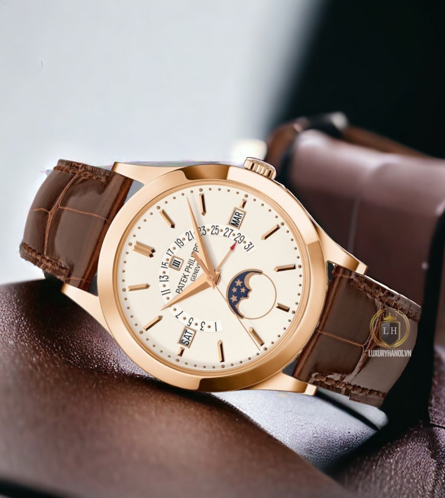 • Núm chỉnh giờ: Làm bằng vàng hồng nguyên khối và khắc nổi logo của Patek Philippe