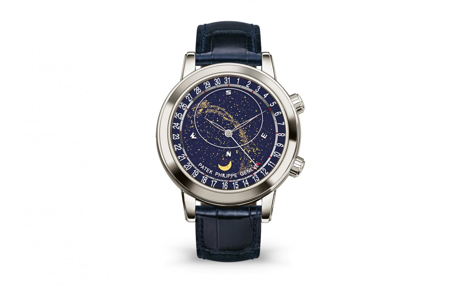 Mặt số: ba đĩa tinh thể sapphire được kim loại hóa cũng như hình elip đóng khung phần bầu trời có thể nhìn thấy từ Geneva.