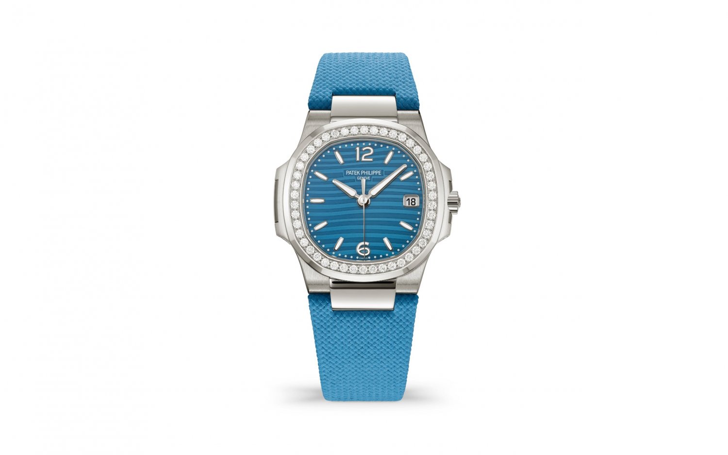 Màu xanh lam sơn mài, họa tiết “sóng”, số và vạch giờ bằng vàng trắng phủ lớp phát quang màu trắng.