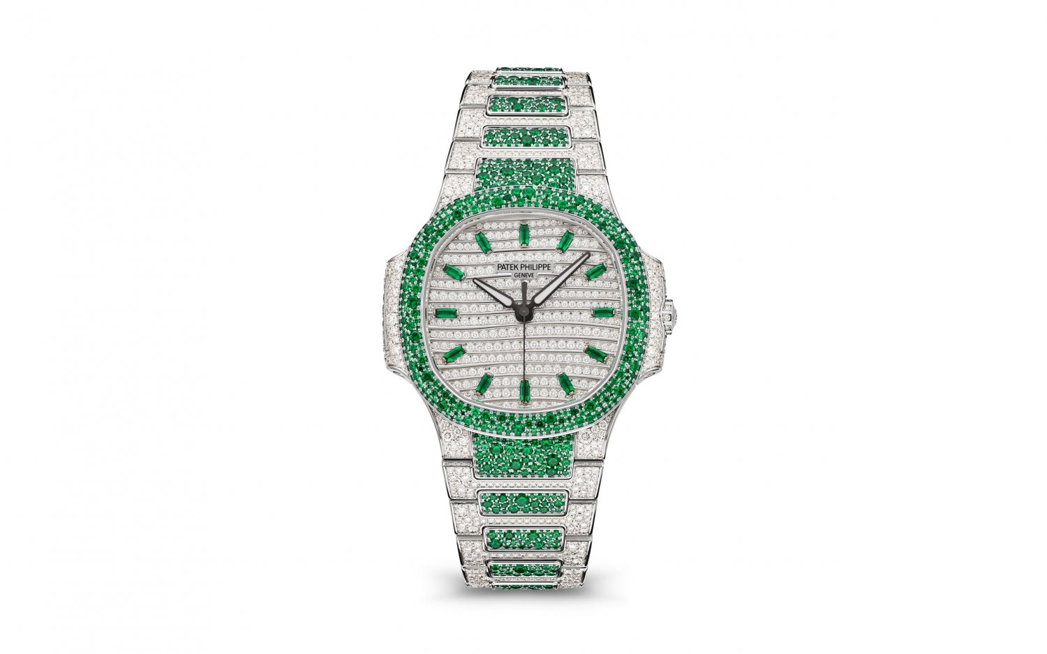 Được lát hoàn toàn bằng kim cương và ngọc lục bảo. 283 viên kim cương: 1,07 ct. (quay số). 12 viên ngọc lục bảo: 0,29 ct. (điểm đánh dấu giờ). 241 viên kim cương: 1,08 ct. (trường hợp). 367 viên ngọc lục bảo: 1,36 ct. (khung viền). 976 viên kim cương: 4,38 cts. (vòng đeo tay). 497 viên ngọc lục bảo: 2,03 cts. (vòng đeo tay). Tổng cộng có 1.500 viên kim cương (6,53 cts) và 876 viên ngọc lục bảo (3,68 cts).