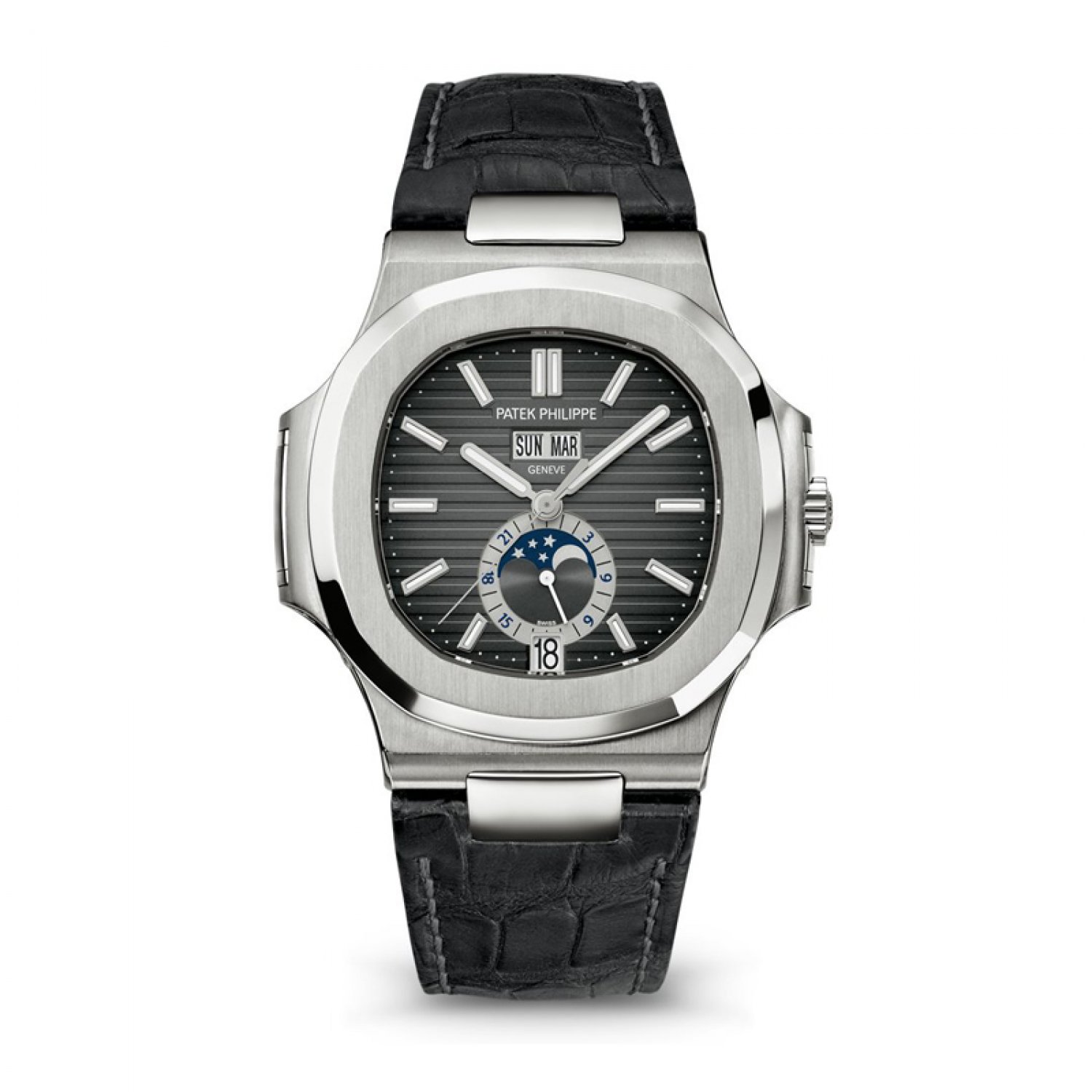 Dây đeo cá sấu có vảy hình chữ nhật, khâu tay, màu đen mờ. Khóa gập Nautilus