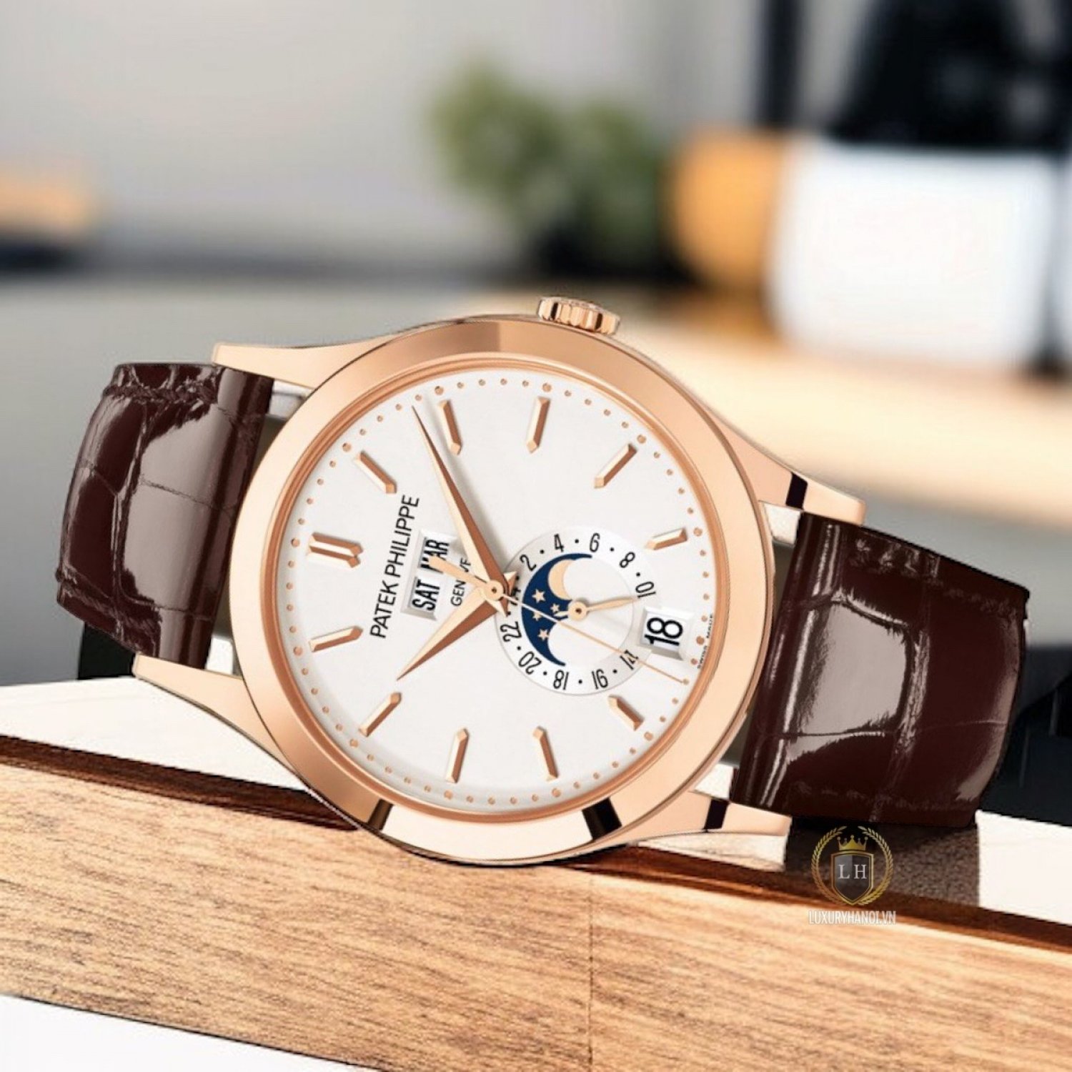 • Núm chỉnh giờ: Làm bằng vàng hồng nguyên khối và khắc nổi logo của Patek Philippe