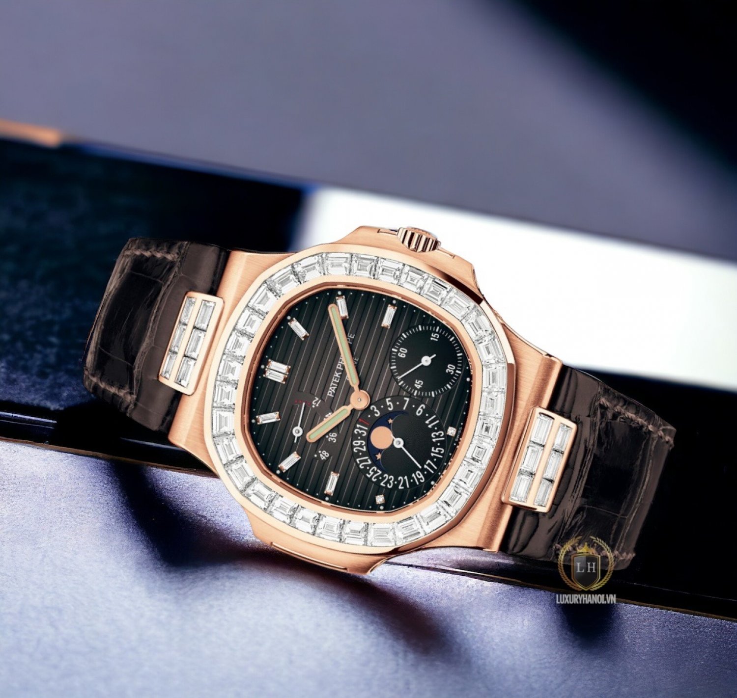 Dây đeo: cá sấu màu nâu sô-cô-la sáng bóng. Khóa gập Nautilus.