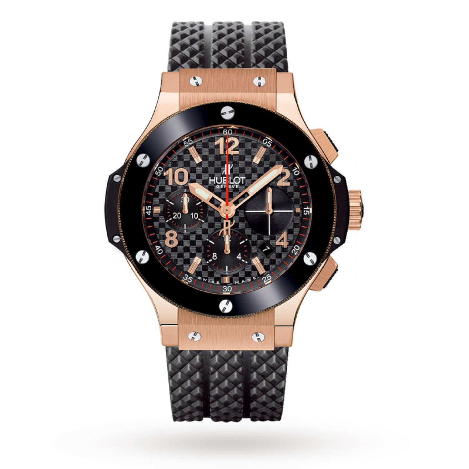 Hublot Big Bang vàng 41mm. Vỏ tròn 41mm bằng Vàng hồng 18K. Viền bằng gốm đen với 6 ốc vít màu bạc. Mặt số màu đen với các mặt số phụ bấm giờ ở vị trí 9 và 6 giờ và kim giây trung tâm màu đỏ; mặt số phụ giây nhỏ ở vị trí 3 giờ; hiển thị ngày ở vị trí 4 giờ. Dây đeo cao su màu đen có khóa gập bằng nút nhấn. Bộ chuyển động bấm giờ tự lên dây HUB 4300 với khả năng dự trữ năng lượng 42 giờ.