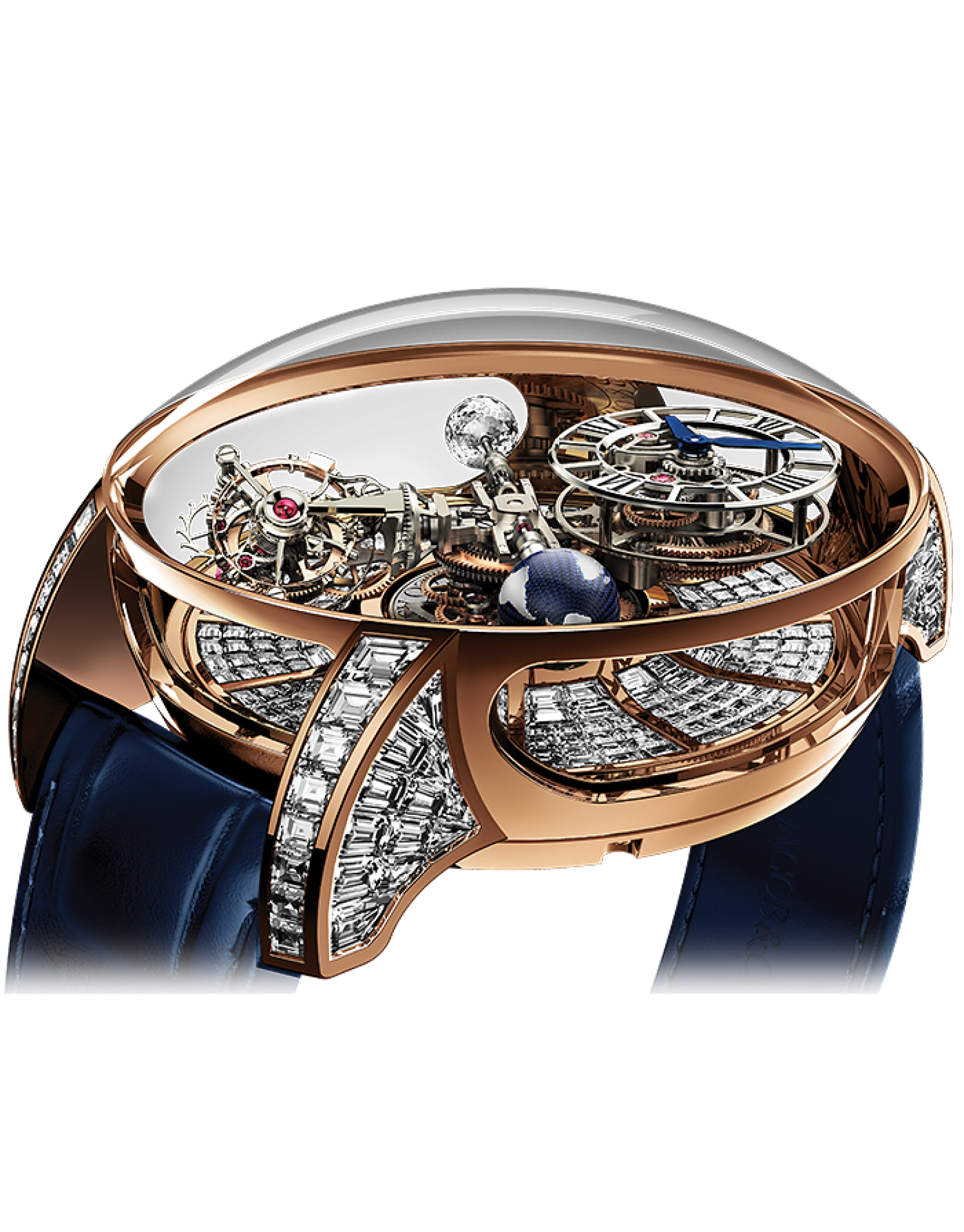 CHỨC NĂNG: Quay số giờ, phút Quay trong 20 phút trên Trục trung tâm, Hệ thống bánh răng vi sai được cấp bằng sáng chế; Kim cương hình cầu nhiều mặt Quay trong 60 giây trên 2 trục (Trọng lượng: 1 carat; 288 Mặt cắt độc quyền được cấp bằng sáng chế của Jacob) Quả cầu sơn mài magiê quay trong 60 giây trên 2 trục; Lồng Tourbillion hấp dẫn Quay trên 3 trục: Trục thứ 1: trong 60 giây, Trục thứ 2: trong 5 phút, Trục thứ 3: Trục giữa trong 20 phút.