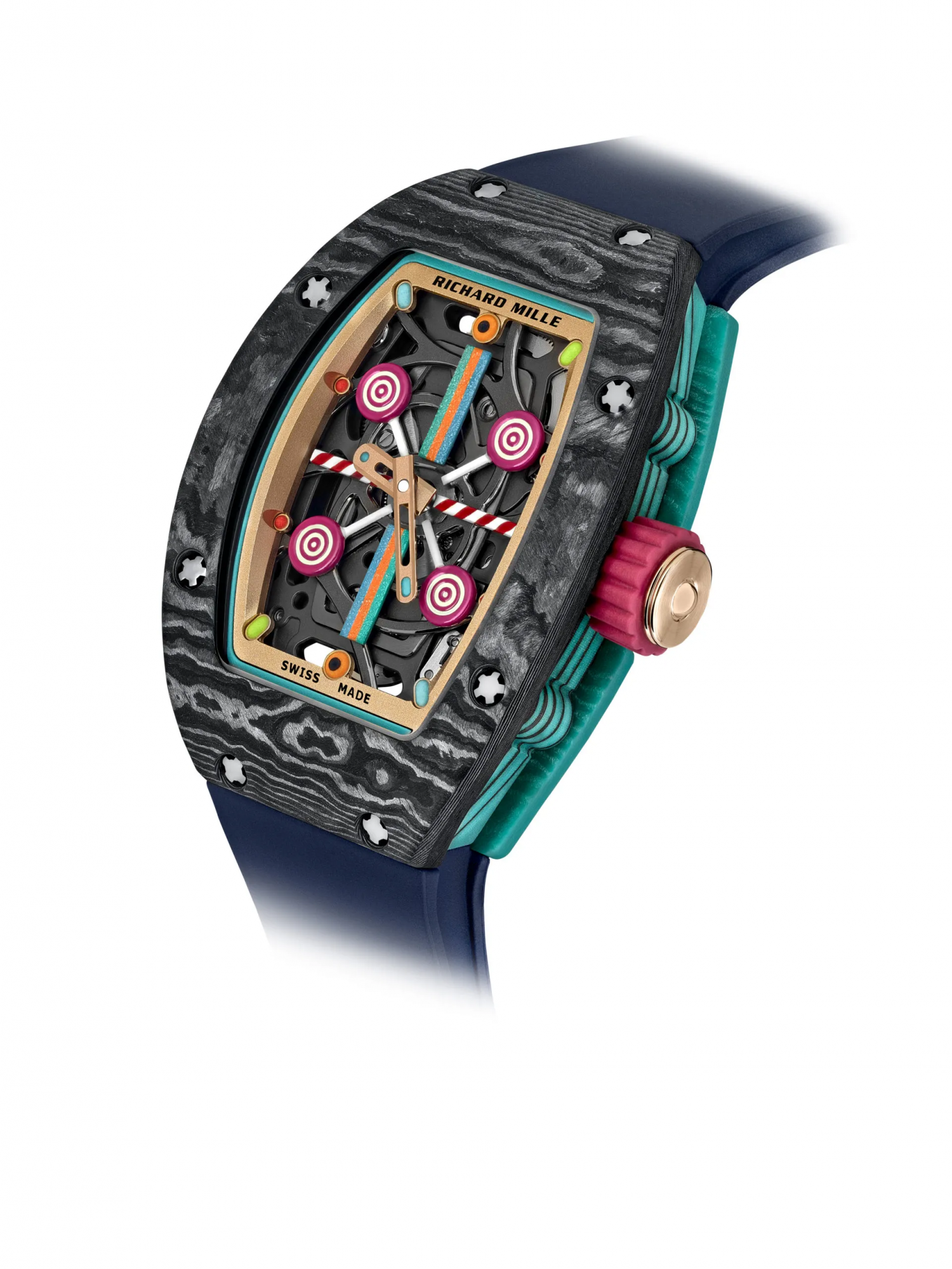 Viền trước của RM 07-03 Myrtille được làm từ Carbon TPT® và mặt sau của nó sử dụng Quartz TPT® màu ngọc lam mới. Dây đeo sử dụng dải màu chuyển màu của Carbon TPT® /turquoise Quartz TPT®, tạo ra sự chuyển đổi màu sắc trang nhã từ viền sang vỏ sau. Mặt số bằng titan cấp 5 được xử lý Titalyt® màu xám. Mỗi viên kẹo được sơn bằng sơn acrylic và sơn mài bằng tay với một chút hiệu ứng đường.