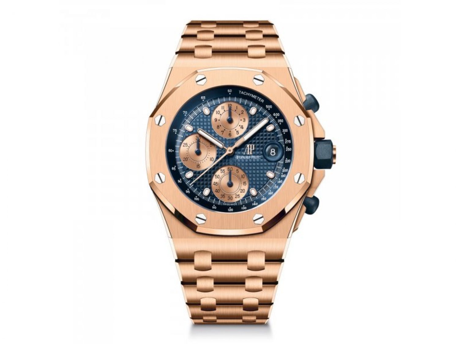 Mặt số màu xanh lam với hoa văn “Petite Tapisserie”, mặt số tông màu vàng hồng, vạch chỉ giờ màu vàng hồng và kim Royal Oak có lớp phủ phát quang, viền bên trong màu xanh lam.