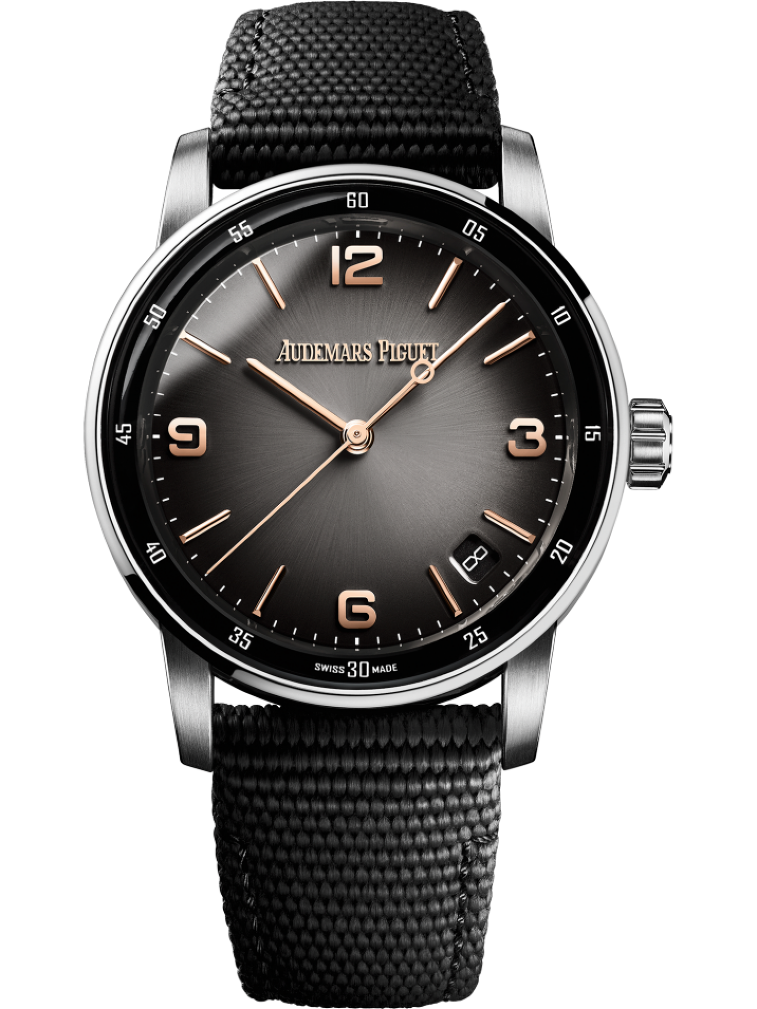 Mặt đồng hồ sơn mài màu xám khói với đế có họa tiết tia nắng, vạch chỉ giờ và kim màu vàng hồng, viền bên trong sơn mài màu đen.