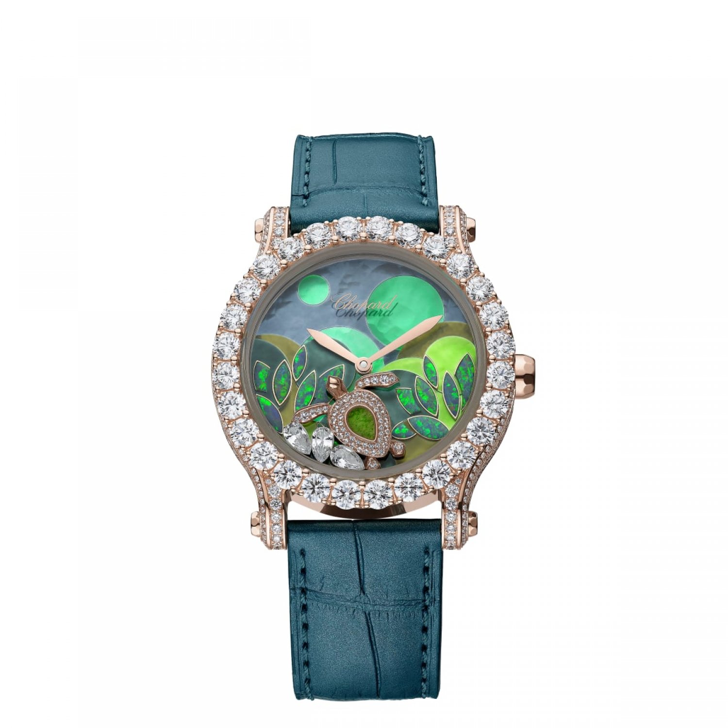 Mặt số bằng vàng hồng 18k đạo đức với họa tiết nền biển bao gồm đá opal và kết cấu xà cừ xanh dương và xanh lá cây. Điện thoại di động Turtle bằng vàng hồng 18k đạo đức đính cabochon aventurine tự nhiên và những viên kim cương cắt sáng chói. Ba viên kim cương nhảy múa hình quả lê.