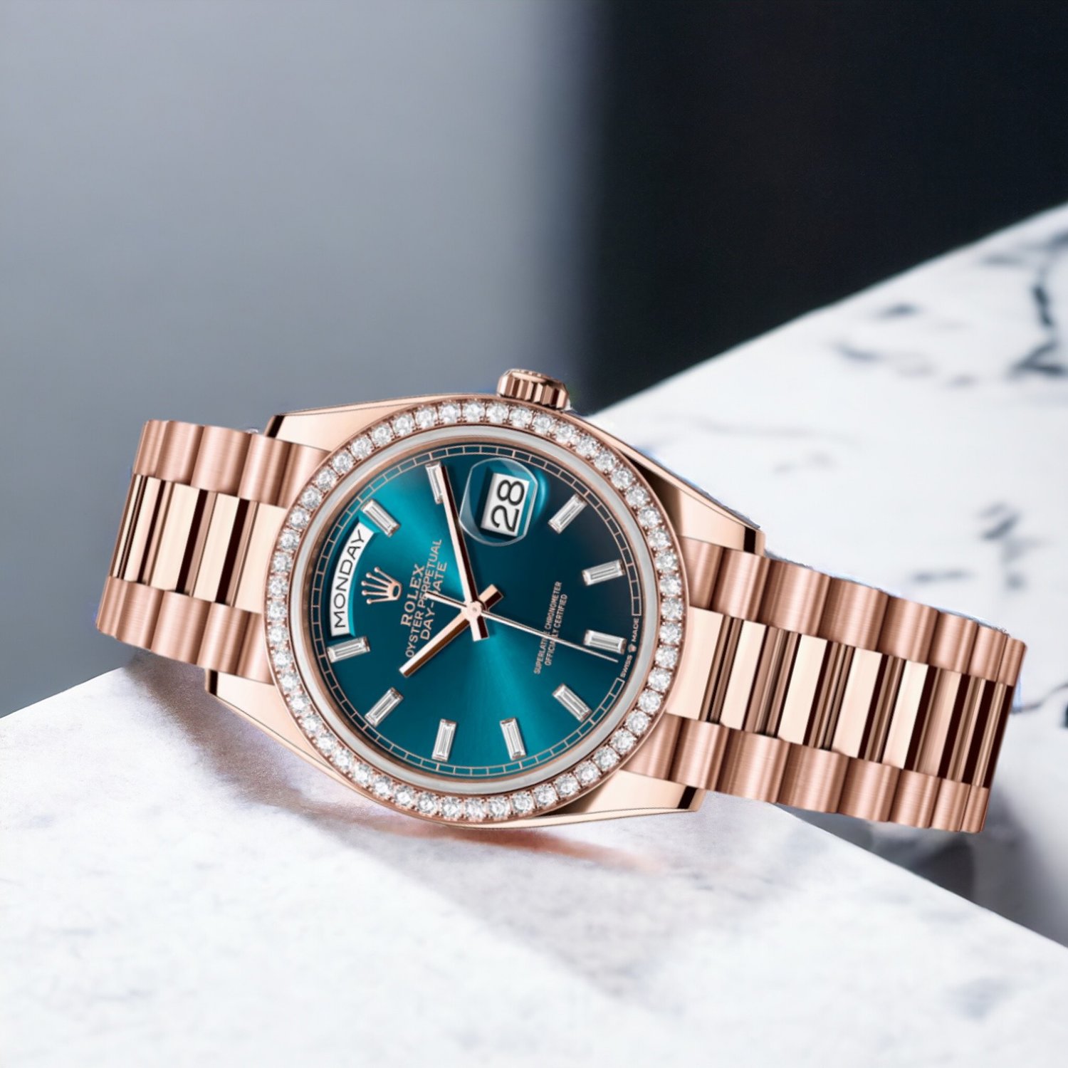 Đồng Hồ Rolex Day-Date 36mm 128345RBR Mặt Số Xanh Lục Lam Dát Kim Cương