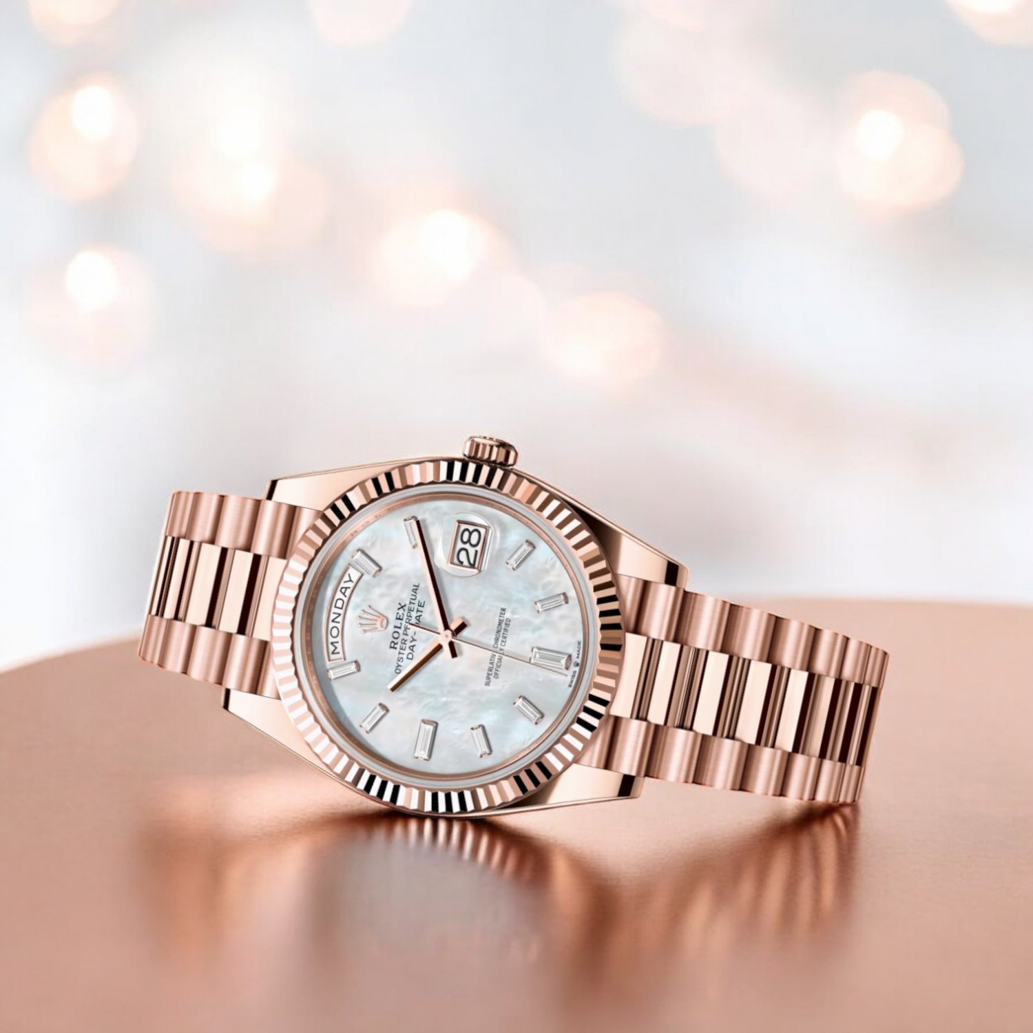 Đồng hồ Rolex Day-Date 40mm Vàng Everose Mặt Số Ngọc Trai Trắng, Nạm Kim Cương 228235
