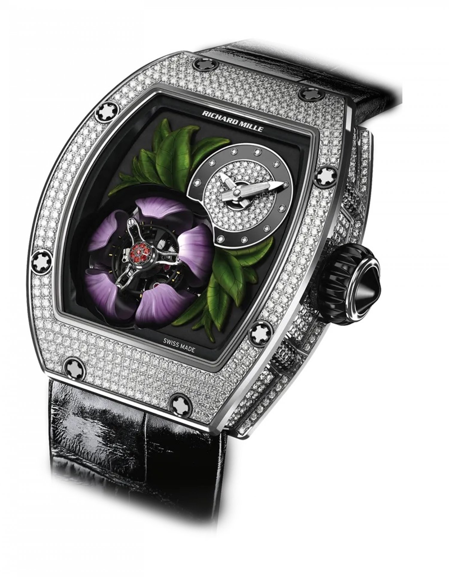 RM19-02 đặc biệt ở chỗ cỗ Tourbillon hoàn toàn được giấu kín dưới bông hoa Mộc Lan tím. Cứ 5 phút một lần, các cánh hoa hé nở thì lúc đó cỗ máy đắt giá này cũng như phần nhuỵ hoa bằng đá quý.mới được khoe trọn trong tầm mắt của người xem.
