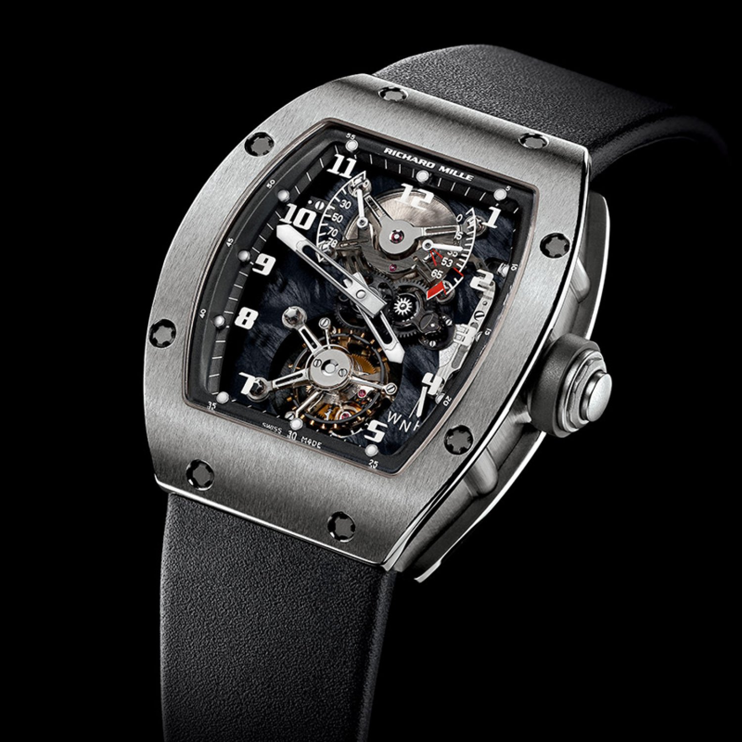 45mm x 38,30mm x 11,95mm Vỏ vàng trắng 18K, mặt sau bằng pha lê sapphire, mặt số màu xám, chuyển động tourbillon lên dây bằng tay Calibre RM 002-V2 với giờ, phút, dự trữ năng lượng, chỉ báo mô-men xoắn và bộ chọn chức năng, dự trữ năng lượng khoảng 70 giờ, màu đen dây da. Khả năng chống nước đến 50 mét.