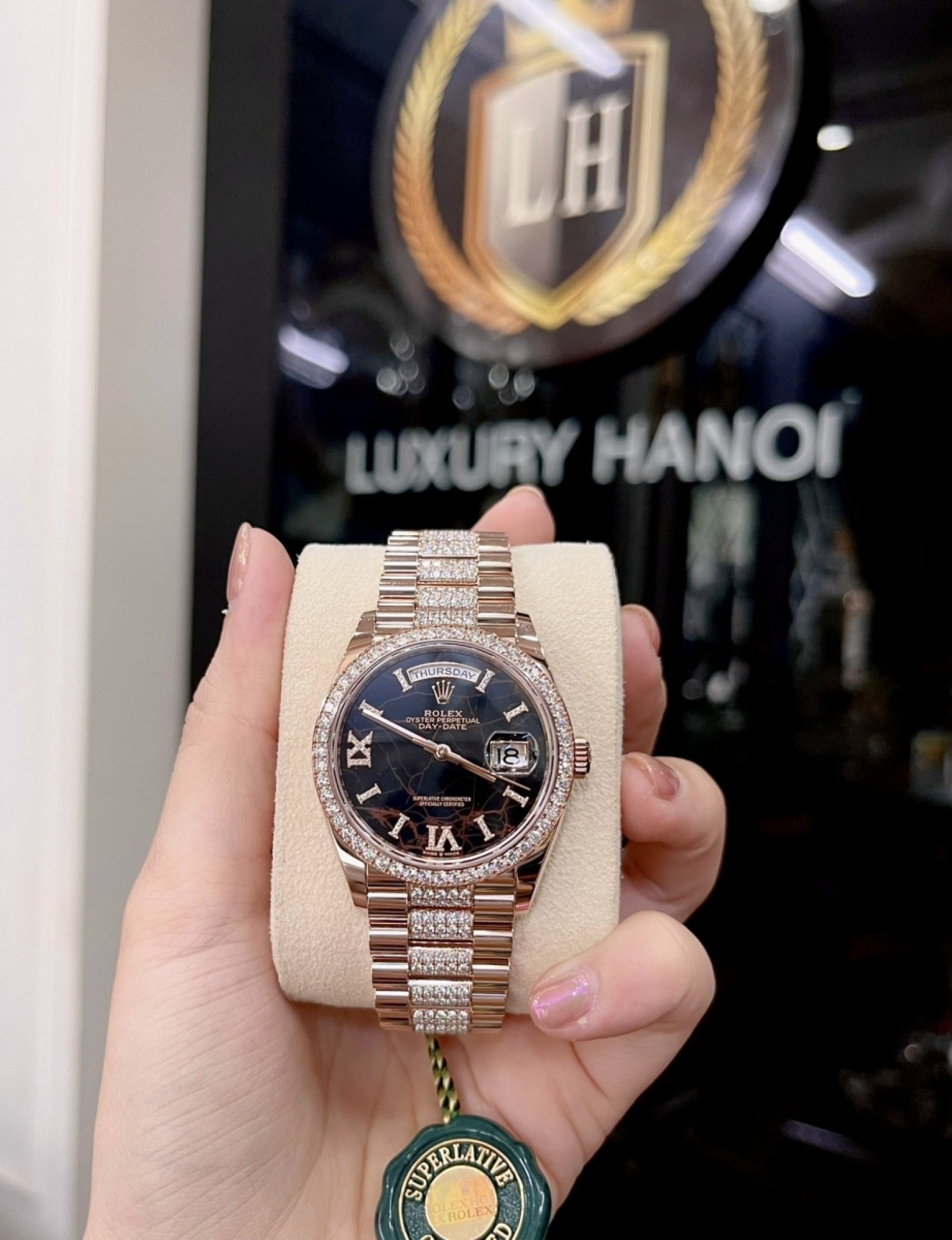 Đồng Hồ Rolex Day-Date 36mm 128345RBR Mặt Số Thạch Anh Cọc Số La Mã Dây Đeo Nạm Kim Cương