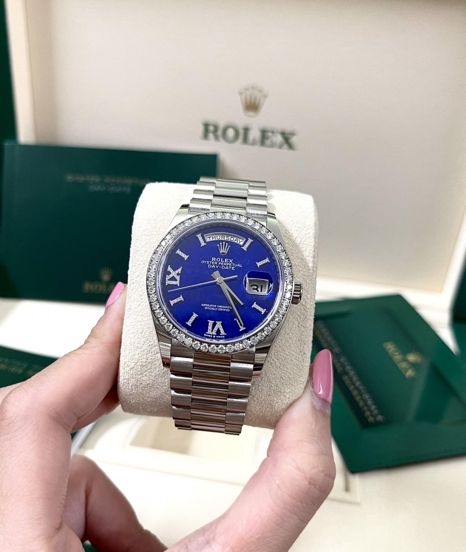 Điểm dấu giờ bằng vàng 18 ct, được đặt với 32 viên kim cương, chữ số La Mã VI và IX bằng vàng 18 ct, được nạm bằng 24 viên kim cương