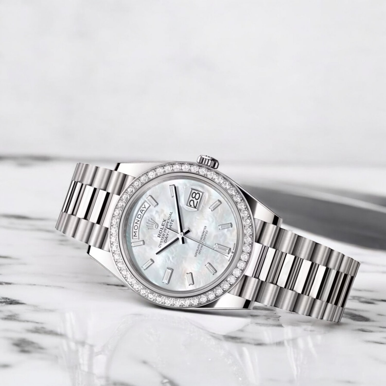Đồng Hồ Rolex Day-Date 40 vàng trắng,mặt số ngọc trai trắng, nạm kim cương 228349RBR