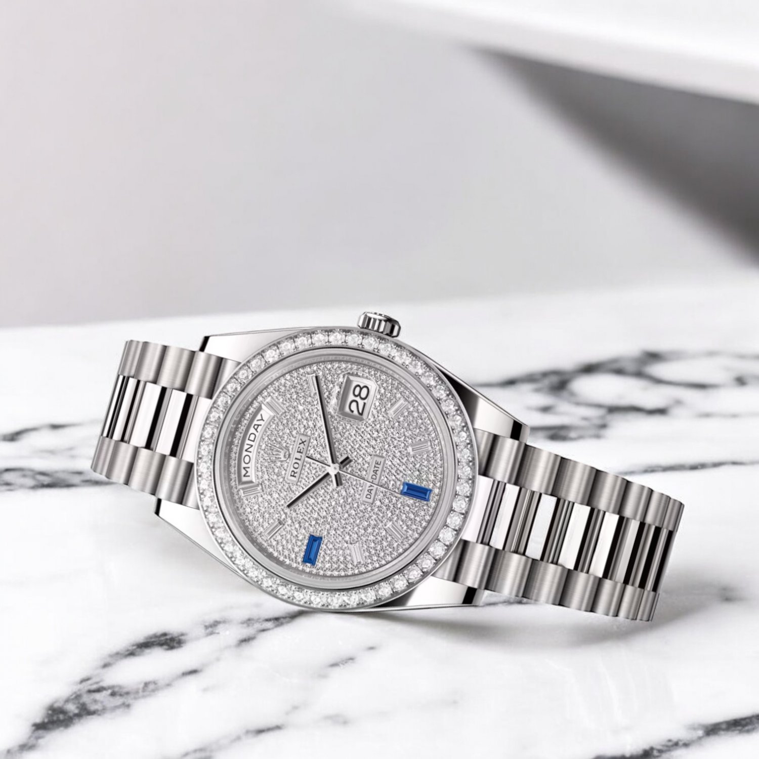Mặt đồng hồ nạm kim cương với 8 viên kim cương hình chữ nhật và 2 viên ngọc bích hình chữ nhật tại điểm 6 và 9 giờ