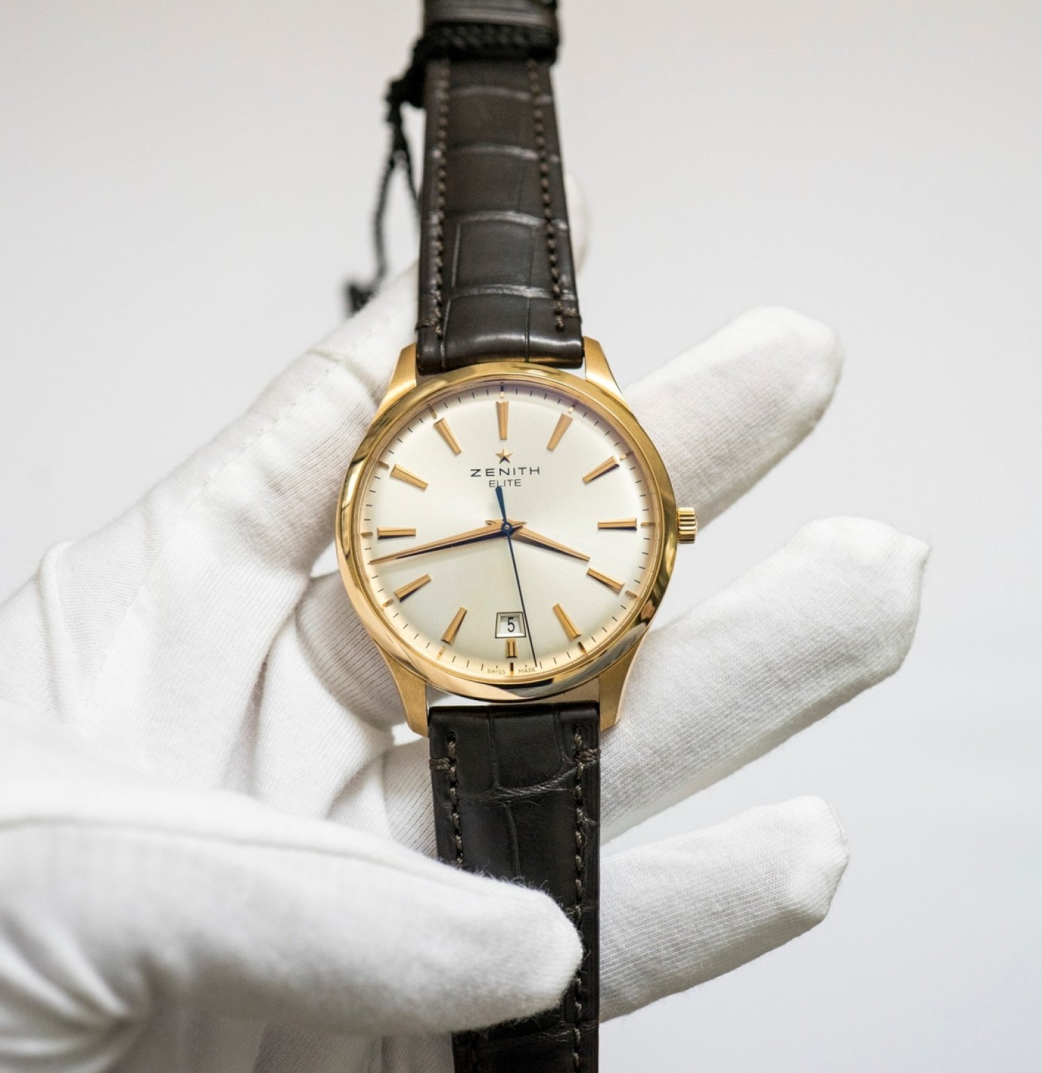 - Núm chỉnh giờ: Làm bằng vàng nguyên khối và khắc nổi logo Zenith