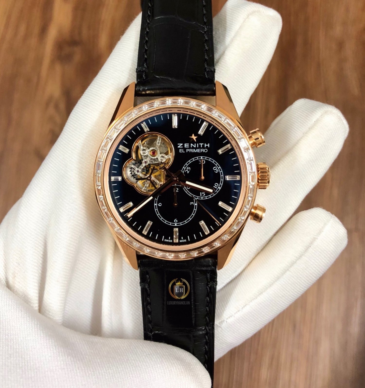 • Núm chỉnh giờ: Làm bằng vàng hồng nguyên khối và khắc nổi logo Zenith, có 02 nút phụ